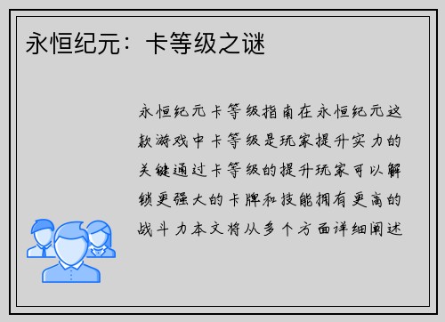 永恒纪元卡等级指南 在《永恒纪元》这款游戏中,卡等级是玩家提升实力的关键。通过卡等级的提升,玩家可以解锁更强大的卡牌和技能,拥有更高的战斗力。本文将从多个方面详细阐述如何卡等级,帮助玩家在游戏中取得更...